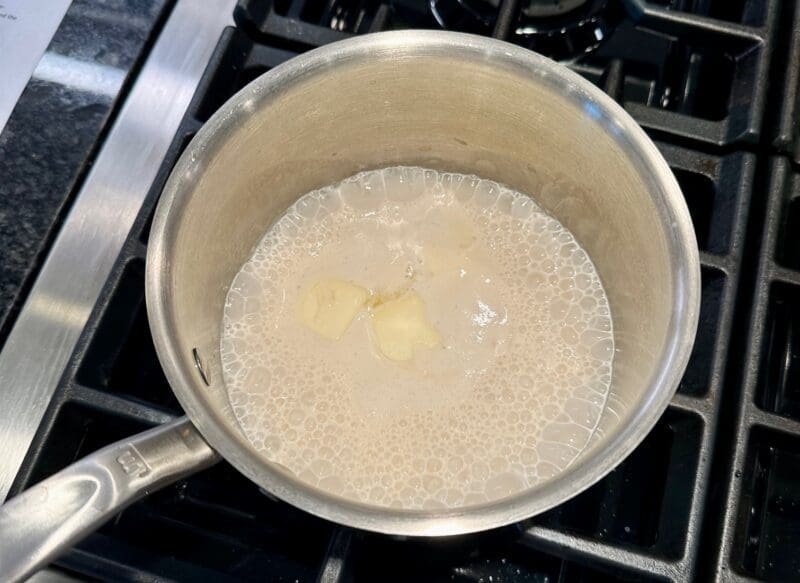 3. To finish, return it to a boil, then reduce the heat to medium-low and add cold butter a few pieces at a time, whisking constantly until all the butter is incorporated into the sauce. Do not let it overheat by lifting the pan occasionally off the heat.