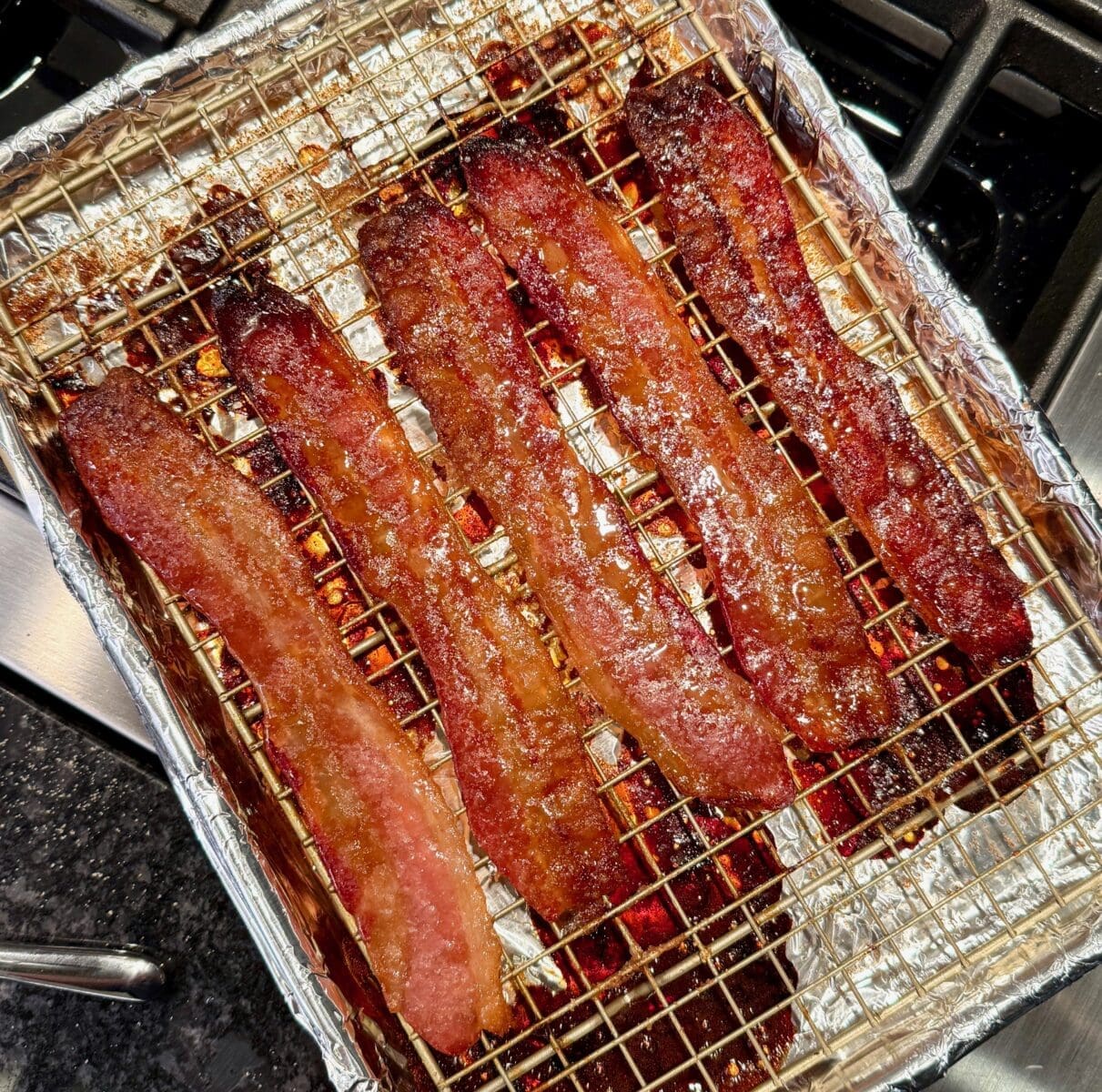 - Use a pastry brush to cover the tops of the bacon with syrup, then sprinkle half the brown sugar over the bacon slices. Flip the bacon over and repeat the process on the other sides