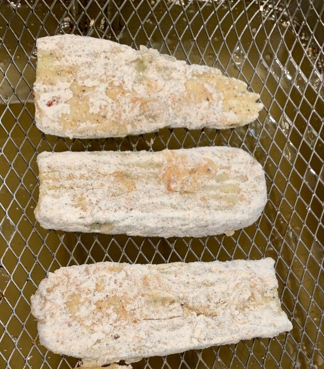 Using a skillet or deep fryer heat the oil to 375 degrees. Dredge the slices in wet, then dry mix and repeat a second time. Gently place them in a fry basket or skillet, but don’t overload them to ensure a crisp result.